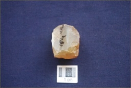 | Description / विवरण | Core with prepared platform and three blade scars, made on Chalcedony, by-product of stone tool manufacturing. |