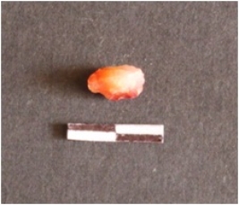| Description / विवरण | The carnelian piece is oblong, with a sharp edge and a ridge as a result of flaking. |