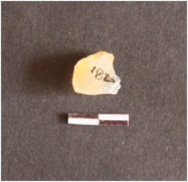 | Description / विवरण | The quartz piece has a pointed end and a bulb of percussion. The piece has a flat end and sharp edges as a result of flaking. |