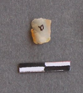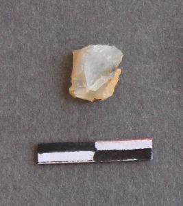 | Description / विवरण | A small flake of chalcedony with a tiny section of cortex, translucent with bulb of percussion seen flaked. |