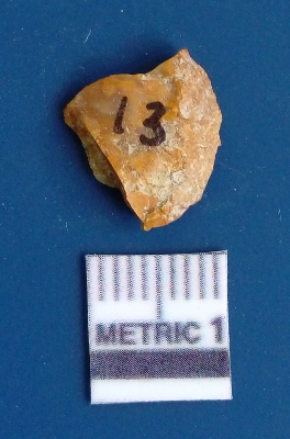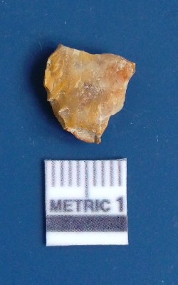 | Description / विवरण | The chert piece is dark in color, with a prominent bulb of percussion and sharp flaked edges. The piece is a part of lithic debitage or raw material for lithic knapping. The piece shows clear ripple marks and bulb of percussion. |
