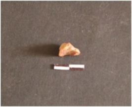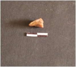 | Description / विवरण | The carnelian flake piece has a sharp edge and a pointed end. The flake has several seondary flake scars and is heat treated. |