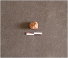 | Description / विवरण | The carnelian piece has rounded edges and a flaked base. The piece is red in colour, has some flake scars on the surface. |