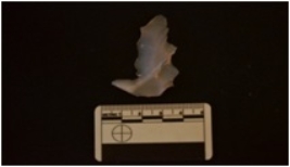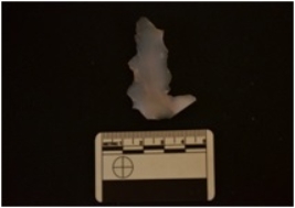 | Description / विवरण | Chalcedony flate blade has ridges with flake scors on dorsal side striking platform, bulb on ventral side and uneven-wavy edges. |