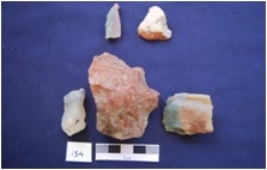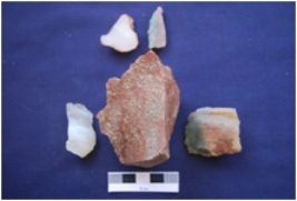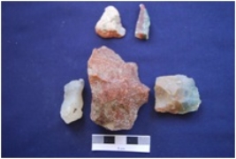 | Description / विवरण | Moss Agate 1 Chert 2 Chalcedony 2 Total No. of Debitage 5. Among them three are utilized flakes, prepared platform, diffused bulb on the vetral side and two are waste flakes. |