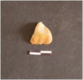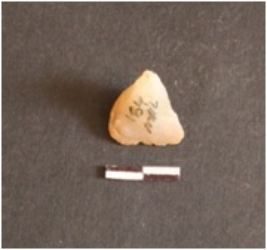 | Description / विवरण | The chalcedony flake has a roughly triangular shape and a sharp edge. The dorsal side has numerous flake scars. |