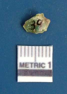 | Description / विवरण | It is a moss agate fragment, translucent in appearance. Natural greenish patches on the fragment, with sharp side rides and flaked scars on the surface. |
