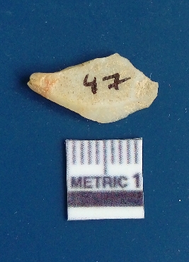| Description / विवरण | The quartz flake has sharp flaked edges and pointed ends as a result of flaking. The piece is semi-transparent in nature with irregular fracture pattern. The piece is roughly triangular in shape and has a prominent bulb of percussion. |