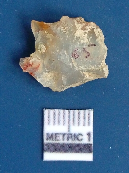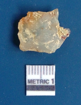 | Description / विवरण | It is chalcedony flake, translucent in appearance. The piece shows sharp pointed ends and flake scars on the surface as a result of flaking. The piece shows a bulb of percussion. |