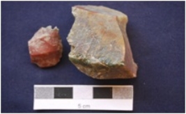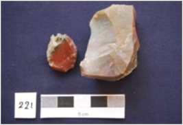 | Description / विवरण | Chert 1 and Quartzite 1. Two flakes, made on chert and quartzite, one has prepared platform whereas the other has narrow platform, bulb absent on the ventral side. |