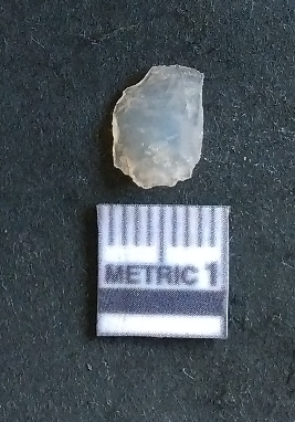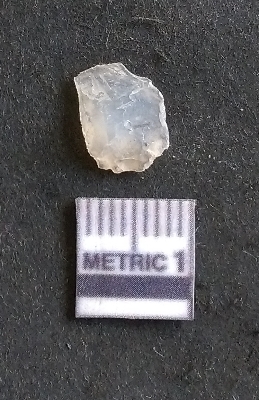 | Description / विवरण | The Quartz flake is small, roughly squarish in shape and shows sharp flaked ends and a prominent bulb of percussion. The piece is translucent white and has an eneven fracture pattern. |