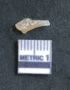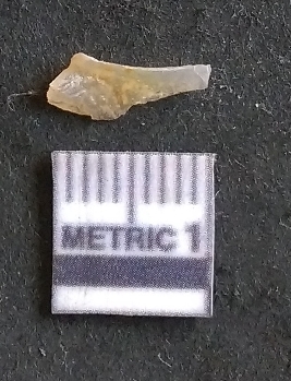 | Description / विवरण | The chalcedony flake is elongated, with a pointed end and sharp flaked ridge. The flake is semi-transparent in nature, with pale brown coloration. The surface shows flake scars. |