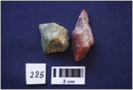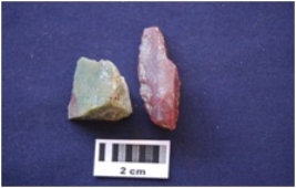| Description / विवरण | Chert 2. Core with flake scars, and a Flake with use-wear marks along the cutting edge, bulb absent on ventral side, prepared platform, made on chert. |