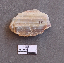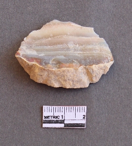 | Description / विवरण | It is an agate nodule. With bulb of percussion on ventral side of the fragment. Flake ridges on the surface. It is a banded agate and translucent in appearance. |