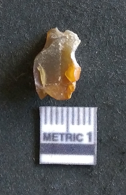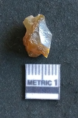 | Description / विवरण | The chalcedony flake is small, yellow in colour and has surfacial flake scars. The piece shows ripple marks as a result of flaking and negative bulb of percussion as a result of flake detachment. It is a secondary flake. |
