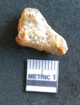 | Description / विवरण | The chalcedony piece is rounded due to rolling and has pale brown coloration with flaked edges as a result of lithic knapping. The piece is elongated in shape and is a part of secondary flaking activity. |