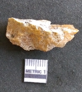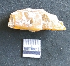 | Description / विवरण | The chalcedony piece has pale brown coloration with flaked edges as a result of lithic knapping. The piece is elongated in shape and is a part of secondary flaking activity. |