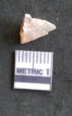 | Description / विवरण | The quartz piece is small, roughly triangular and has sharp flaked edges as a result of flaking activity. The piece is pale yellow in colour and has a crypto-crystalline matrix. |