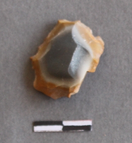 | Description / विवरण | It is lithic debitage with flaked ridges. It is chert stone with bulb of percussion seen on it, it has cortex covered on one side. |