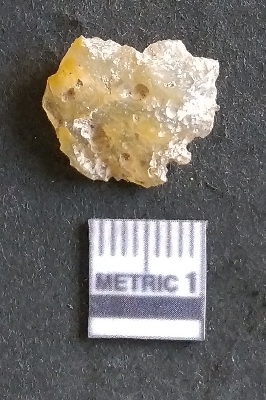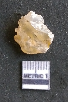 | Description / विवरण | The chalcedony flake is flat, with sharp flaked ends and a positive bulb of percussion. The piece is pale yellow in colour and has a crypto-crystalline matrix. |