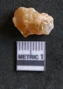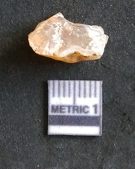 | Description / विवरण | The chalcedony flake is flat, with sharp flaked ends and a positive bulb of percussion. The piece is pale yellow in colour and has a crypto-crystalline matrix. |
