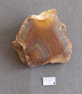 | Description / विवरण | It s an agate fragment, with bulb of percussion on ventral side of the fragment. Flake ridges on the surface. It s a banded agate and translucent in appearance. |