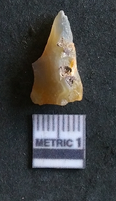 | Description / विवरण | The chalcedony piece is small, thin and has a constriction due to angular flaking. The piece is pale yellow in colour and has crypto-crystalline matrix. |