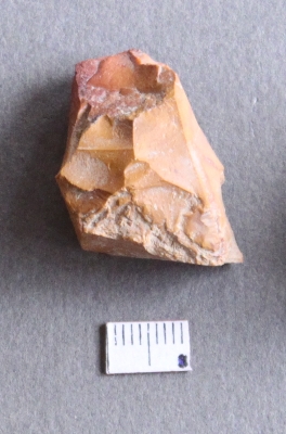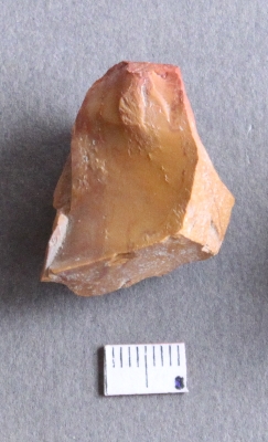 | Description / विवरण | It s a chert nodule with sharp edges and striking platform on the proximal end. Flakes scars on the surface with ripples on it. |