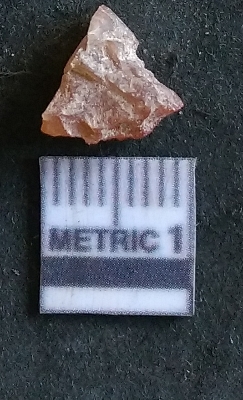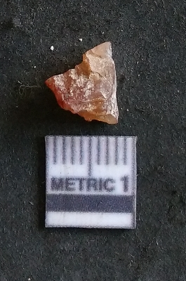 | Description / विवरण | The carnelian flake is small, reddish in colour and has sharp flaked ends as a result of flaking. The piece shows flake scars on the surface and bulb of percussion as a result of lithic knapping. |