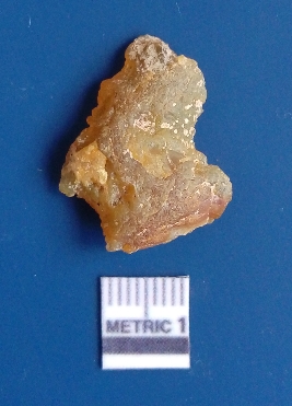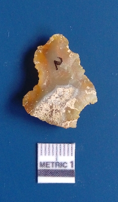 | Description / विवरण | It is chalcedony flake, translucent in appearance. The piece shows sharp pointed ends and flake scars on the surface as a result of flaking. The piece shows a bulb of percussion. |