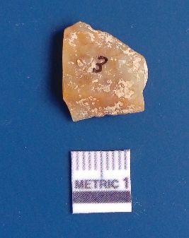 | Description / विवरण | It is chalcedony flake, translucent in appearance. The piece shows sharp pointed ends and flake scars on the surface as a result of flaking. The piece shows a bulb of percussion. |