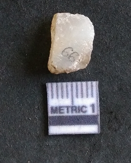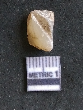 | Description / विवरण | The quartz flake is roughly rectangular in shape and has rolled rounded edges. The piece is semi-transparent, with an uneven fracture pattern. |