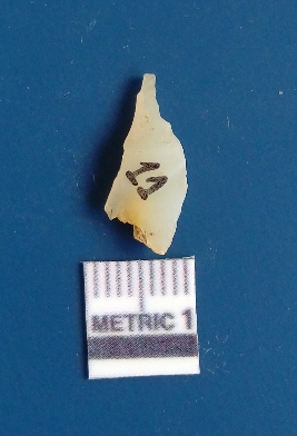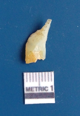 | Description / विवरण | It is chalcedony flake, translucent in appearance. The piece shows sharp pointed ends and flake scars on the surface as a result of flaking. The piece shows a bulb of percussion. |
