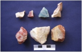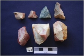 | Description / विवरण | Chert 6 Chalcedony 1 Total No. of Debitage 7. Cores. Among them a few have prepared platform, flake scars on one side, negative bulb on the flake scars. |