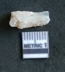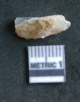 | Description / विवरण | The quartz flake is elongated, with a milky white coloration and uneven fracture pattern. The piece has pointed end and sharp flaked edges a s a result of flaking. |