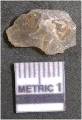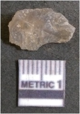 | Description / विवरण | The flake has irregular fracture pattern and sharp flaked edges as a result of lithic knapping activity. The piece is pale, with surfacial flake scars and a bulbous end. The flake is of smoky quartz variety, grayish in colour and translucent in appearance. |
