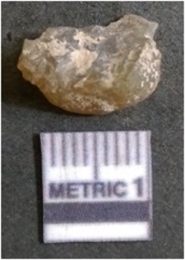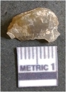 | Description / विवरण | The flake has irregular fracture pattern and sharp flaked edges as a result of lithic knapping activity. The piece is pale, with surfacial flake scars and a bulbous end. The flake is of smoky quartz variety, grayish in colour and translucent in appearance. |