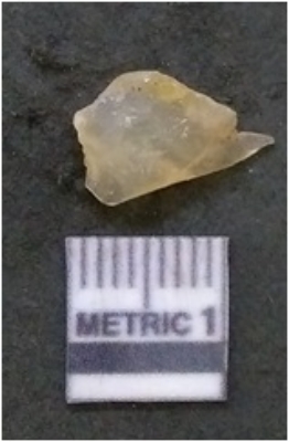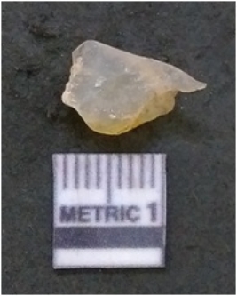 | Description / विवरण | It is chalcedony flake, translucent in appearance. The piece shows sharp pointed ends and flake scars on the surface as a result of flaking. The piece shows a bulb of percussion. |