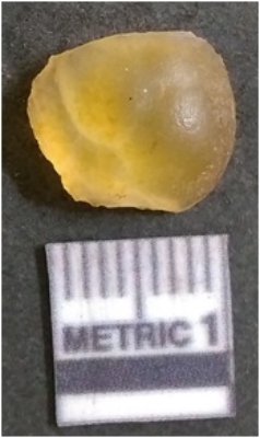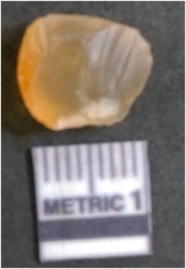 | Description / विवरण | It is chalcedony flake, translucent in appearance. The piece shows sharp pointed ends and flake scars on the surface as a result of flaking. The piece shows a bulb of percussion. |