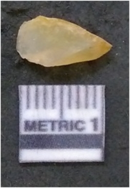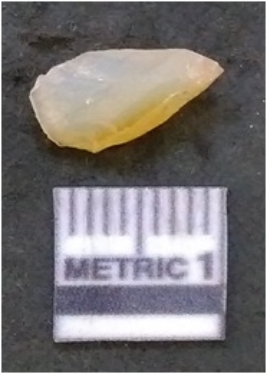 | Description / विवरण | It is chalcedony flake, translucent in appearance. The piece shows sharp pointed ends and flake scars on the surface as a result of flaking. The piece shows a bulb of percussion. |