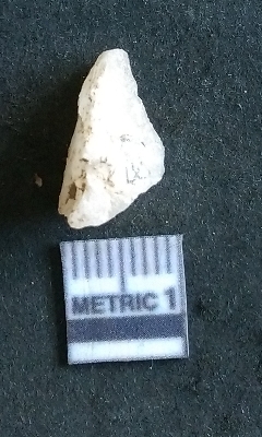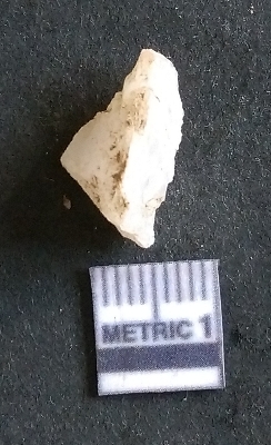 | Description / विवरण | The quartz flake is elongated, with a bulb of percussion and has white colouration. The piece is roughly triangular in shape, and has uneven fracture pattern. |