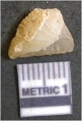 | Description / विवरण | It is chalcedony flake, translucent in appearance. The piece shows sharp pointed ends and flake scars on the surface as a result of flaking. The piece shows a bulb of percussion. |
