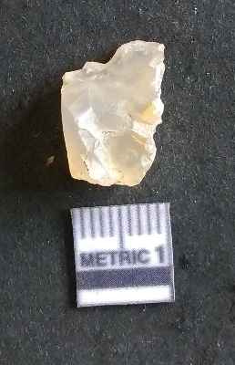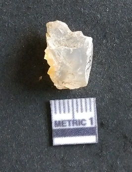 | Description / विवरण | The chalcedony flake is small, translucent and pale yellow in colour. The piece has an uneven fracture pattern and poinnted edges as a result of flkaing. The piece is crypto-crystalline in nature. |