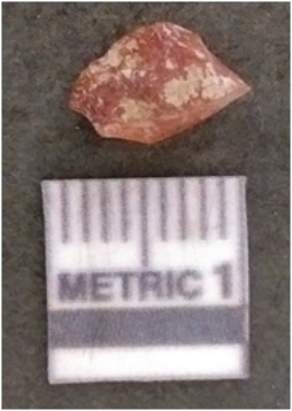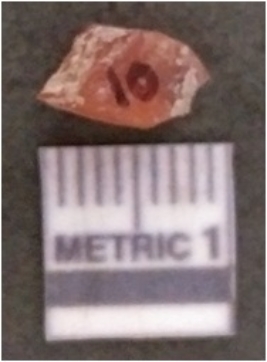| Description / विवरण | It is carnelian flake red in color, with sharp flakes edges and a small bulb of percussion owing to knapping activity. The piece has sharp flaked edges and a crypto-crystalline matrix. |