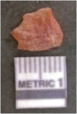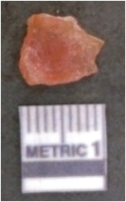 | Description / विवरण | It is carnelian flake red in color, with sharp flakes edges and a small bulb of percussion owing to knapping activity. The piece has sharp flaked edges and a crypto-crystalline matrix. |