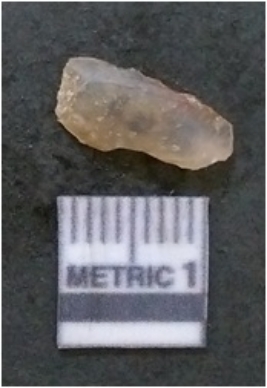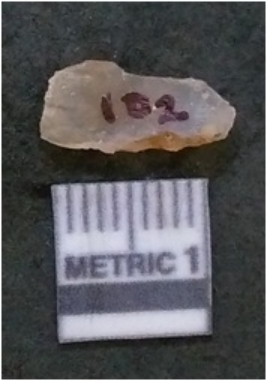| Description / विवरण | It is chalcedony flake, translucent in appearance. The piece shows sharp pointed ends and flake scars on the surface as a result of flaking. The piece shows a bulb of percussion. |