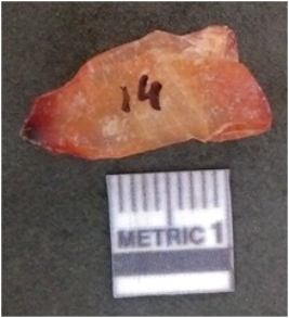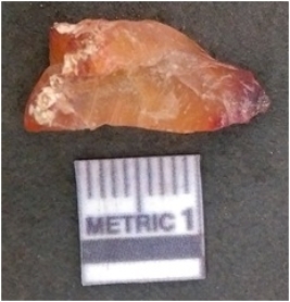 | Description / विवरण | It is carnelian flake red in color, with sharp flakes edges and a small bulb of percussion owing to knapping activity. The piece has sharp flaked edges and a crypto-crystalline matrix. |