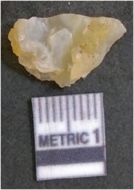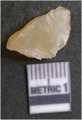 | Description / विवरण | It is chalcedony flake, translucent in appearance. The piece shows sharp pointed ends and flake scars on the surface as a result of flaking. The piece shows a bulb of percussion. |