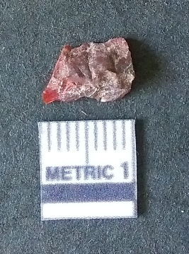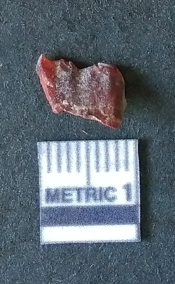 | Description / विवरण | The carnelian piece is small, with flaked edges and negative bulb of percussion. The piece has reddish coloration with crypto-crystalline matrix. |