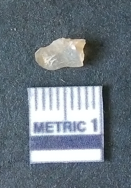 | Description / विवरण | The chalcedony piece is small, with yellowish coloration and flaked edges. The piece has rounded edges and has a prominent bulb of percussion as a result of flaking activity. |